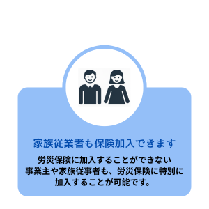 労働者を一人でも雇用する事業主(取締役等)が、労働保険に加入して労働保険事務組合に事務を委託すると、事業主や家族従事者なども特別加入することができます。
