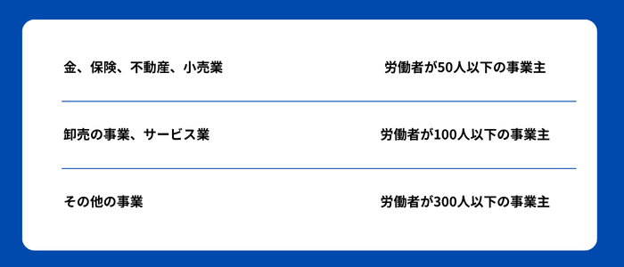 常時使用する労働者が業種ごとに次の人数以下となっていることが必要です。